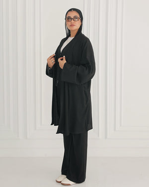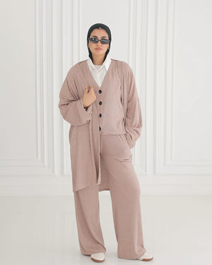 Triko set \nسوت 3 قطع م \nماتريال : ريب تريكو \nمقاسات : من M ل Xl \nمتوفره بألوان : كشمير كافيه اسود \nطول الكاردي : 95cm \nطول البنطلون : 110 cm